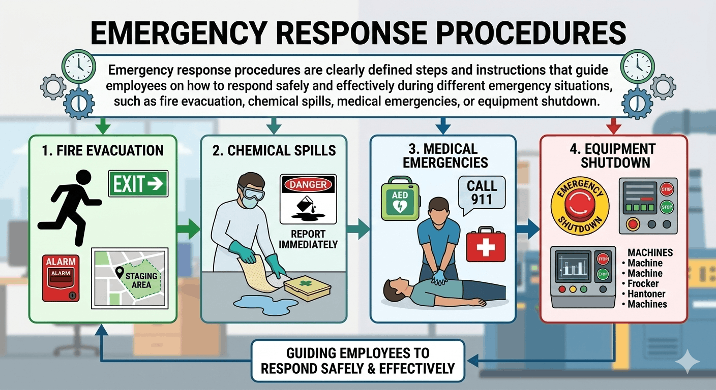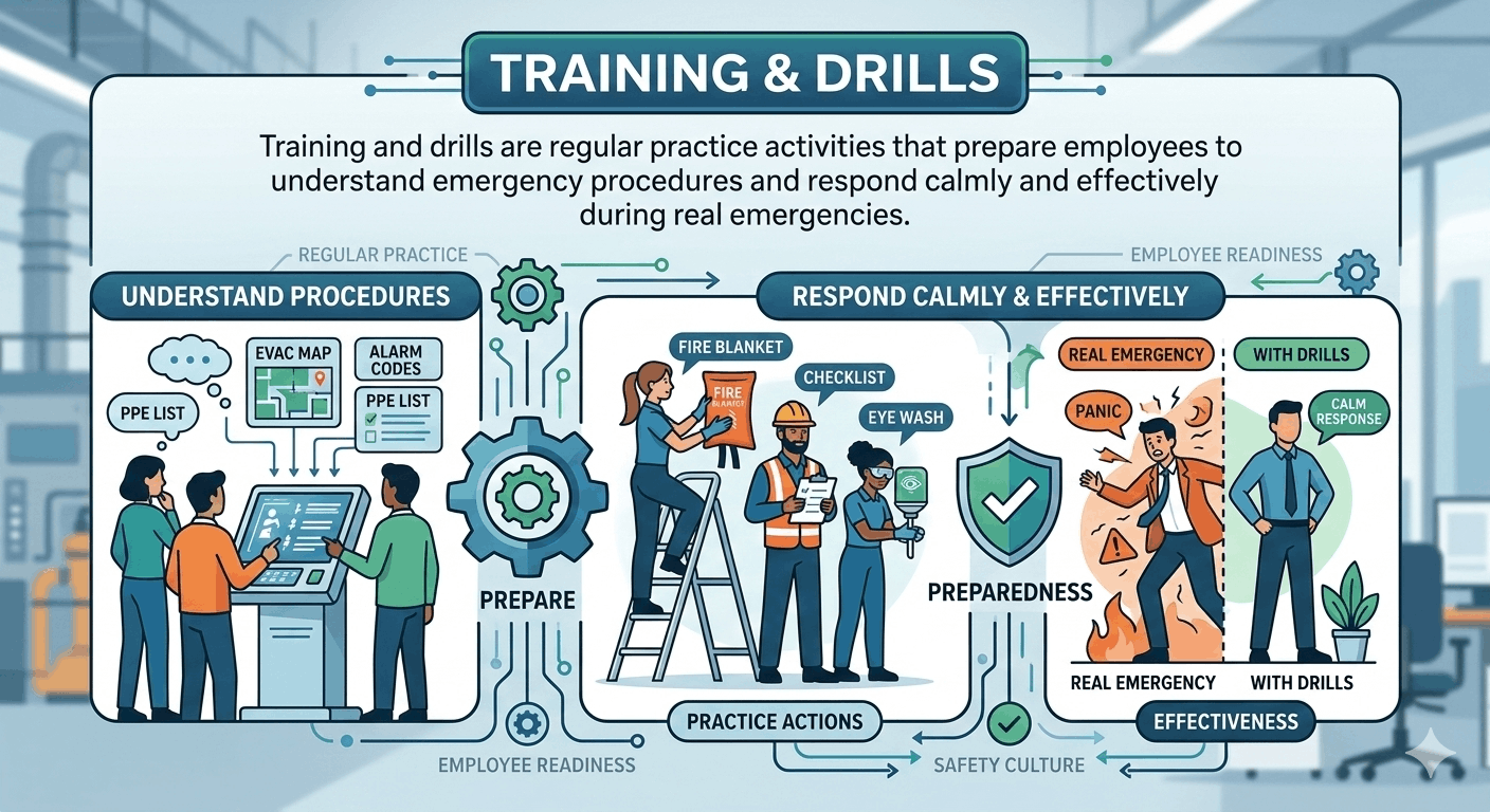 Employees should receive regular training on emergency procedures. Mock drills and simulations help workers practice how to respond during real incidents. These exercises improve confidence and response time. Regular training ensures employees can react quickly and safely in emergencies.