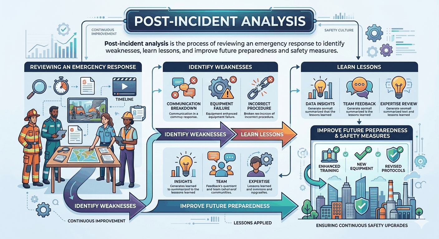 ایمرجنسی کے دوران کیے گئے ردِعمل کا تجزیہ کرنے سے کمزوریوں کی نشاندہی ہوتی ہے اور مستقبل میں آگاہی اور تیاری کو بہتر بنانے میں مدد ملتی ہے۔ مسلسل بہتری کے لیے واقعات اور حاصل ہونے والے اسباق کی دستاویزات تیار کرنا ضروری ہوتا ہے۔