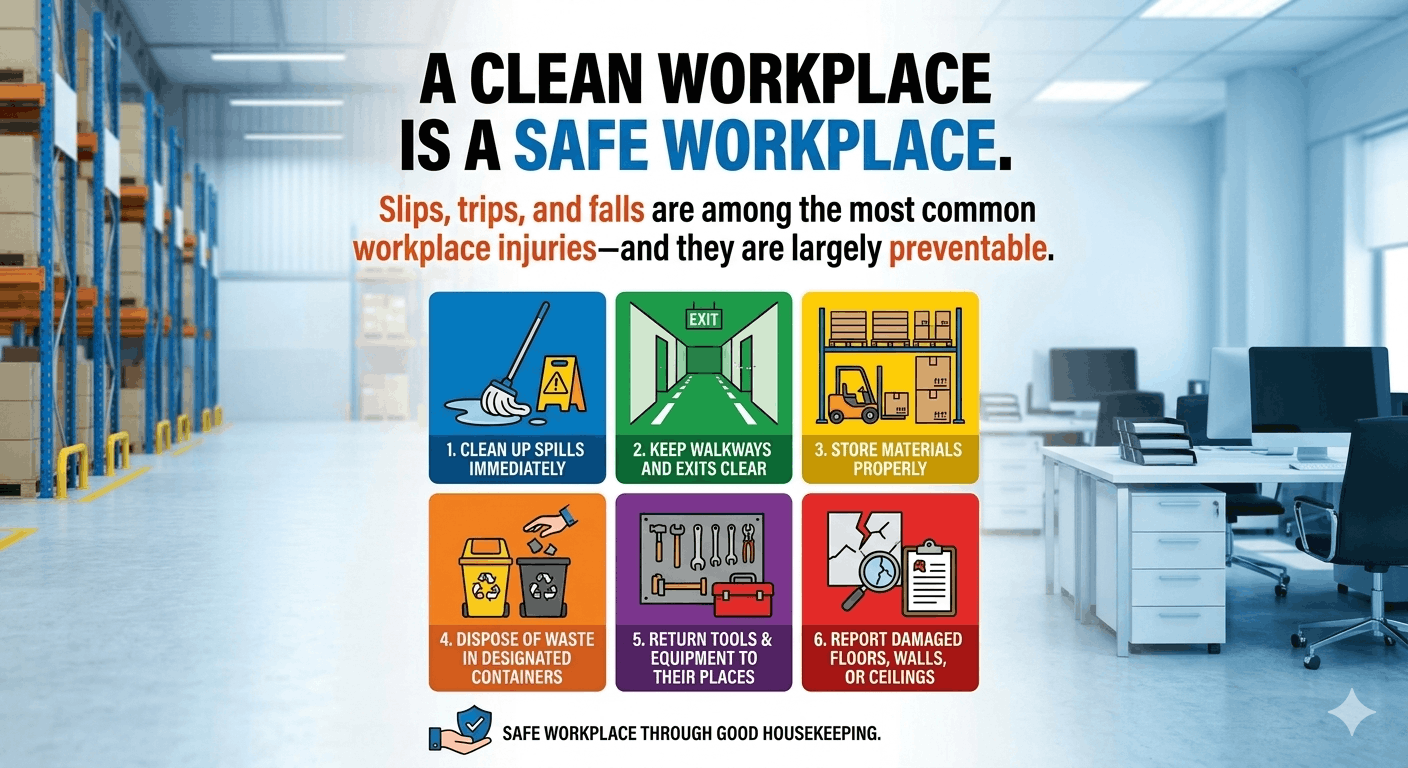 A clean workplace is a safe workplace. Follow these housekeeping rules: